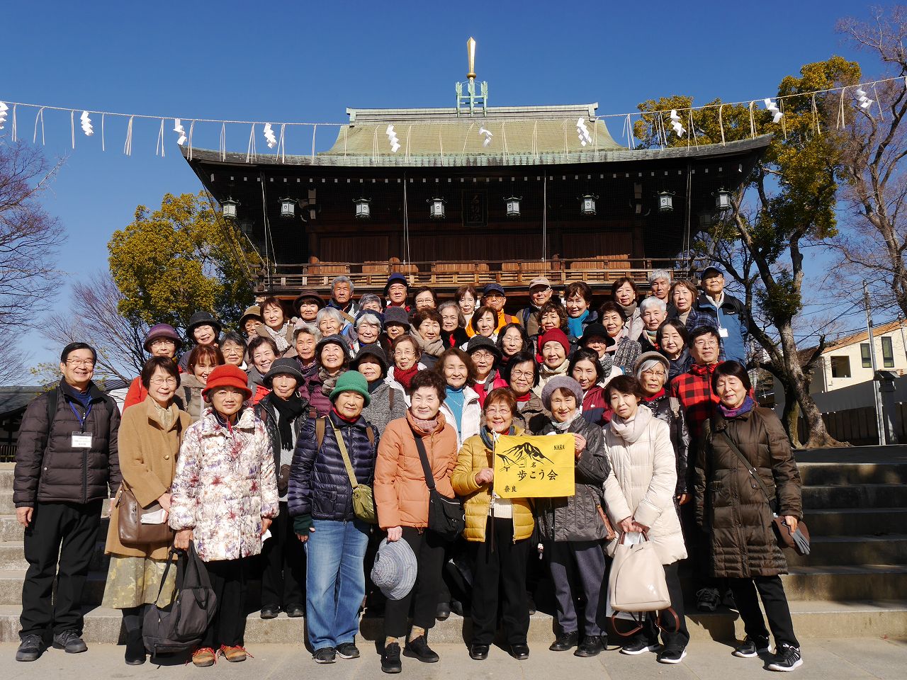 境内では願い事をしたり、摂社・末社巡りをしたりと楽しい時間を過ごされていました。続いて絵馬殿前で記念写真。みなさんの笑顔が最高でした。その後徒歩コースとバスコースに分かれて新年会の会場、ホテルセイリュウへ移動。