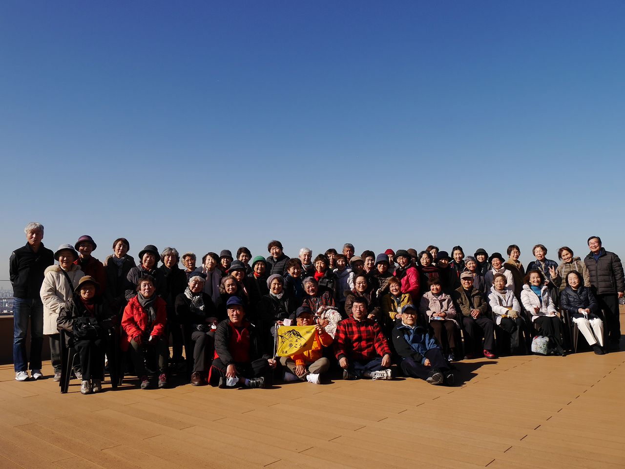 最後は大阪平野の眺望がすばらしいスカイテラスで記念写真を撮って解散。ハードコース参加、ホテルでのくつろぎ、お茶会実施など、今年最初の歩こう会も無事終了しました。