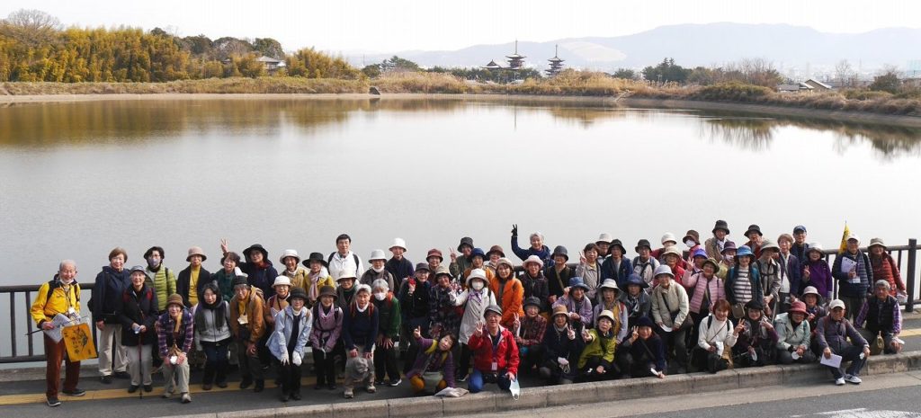 九条駅でミーティングの後、住宅地の細い道を抜けて三松禅寺へ。ここは永平寺より参禅道場として認可された奈良県では珍しい禅寺です。続いて大池へ。池越しの薬師寺や若草山の遠望は奈良観光写真の定番スポット。みなさん撮影に大忙し!