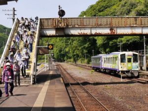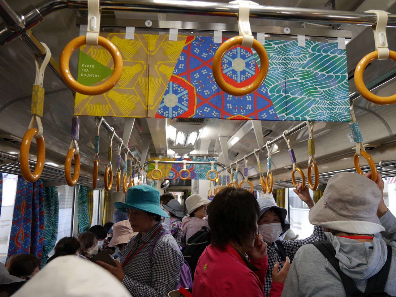 JR奈良駅からは大和路快速で加茂まで移動。加茂からはディーゼルカーで大河原へ。普段は数人しか乗車しない列車はたちまちラッシュです。そんな中、新茶に合わせたカーテンや中吊り広告が心を和ませてくれました。