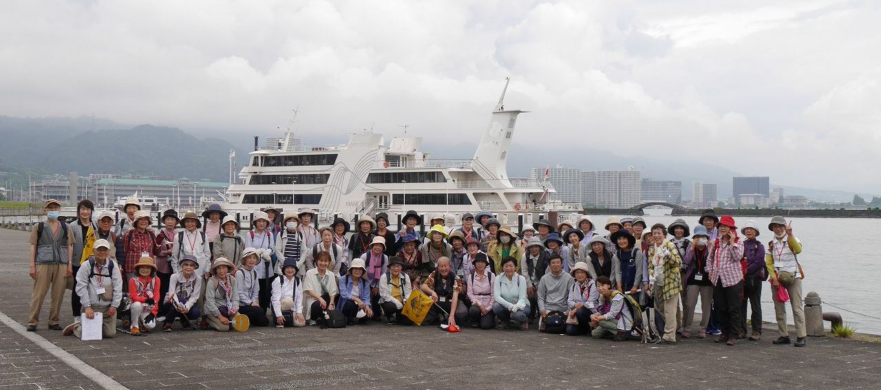 JR大津駅を出発後、まずは琵琶湖畔へ。早速琵琶湖クルーズ船を背景に記念写真。晴れていると比叡山もカメラに収める予定でしたが雲間に隠れて残念でした。