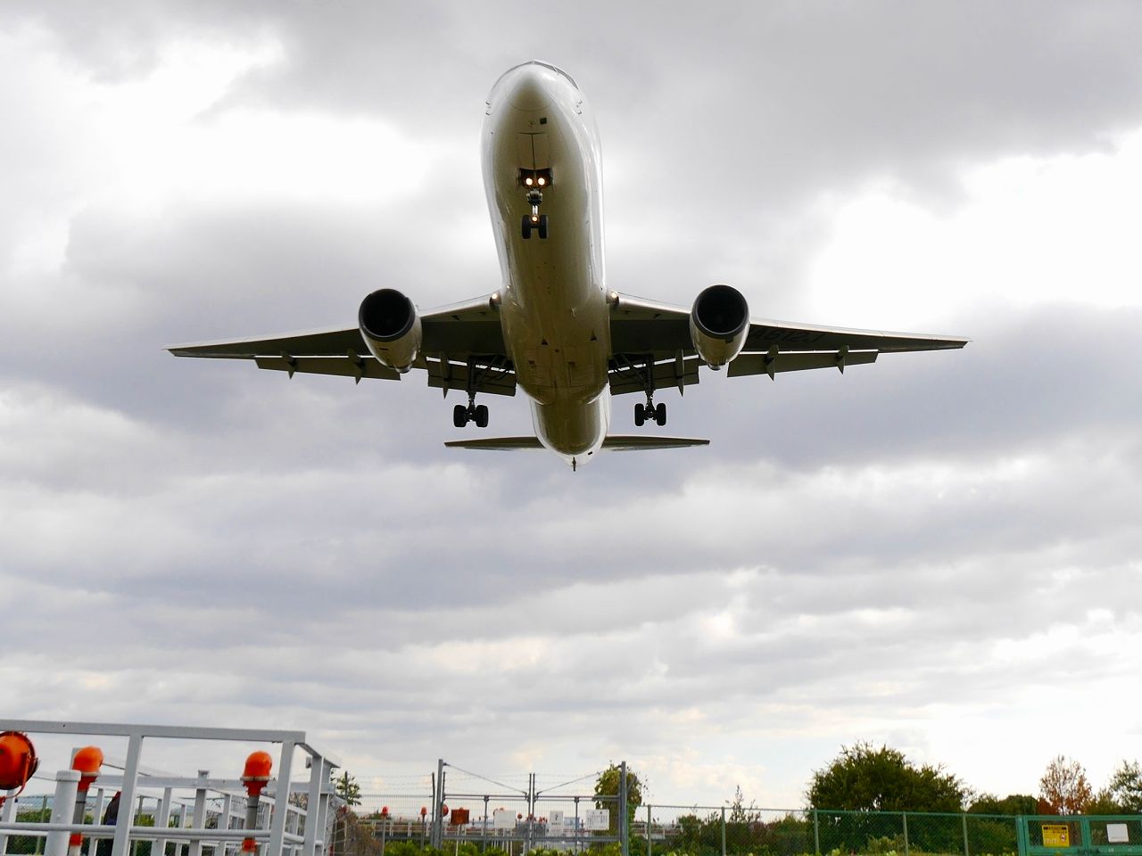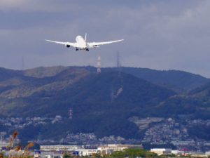 千里川土手上の着陸態勢に入った飛行機。